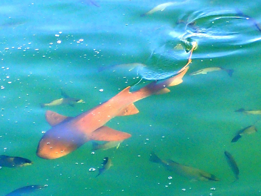 They were amazing. And included friends Guy from Miss Ellie and Steve from October (sitting, with guitars). Lots of fun singing along, lunching with friends, and even swimming in the marina’s pool. On our way back to the dinghy we stopped at the marina’s fish-cleaning station to watch a nurse shark chase down thrown away fish bits.