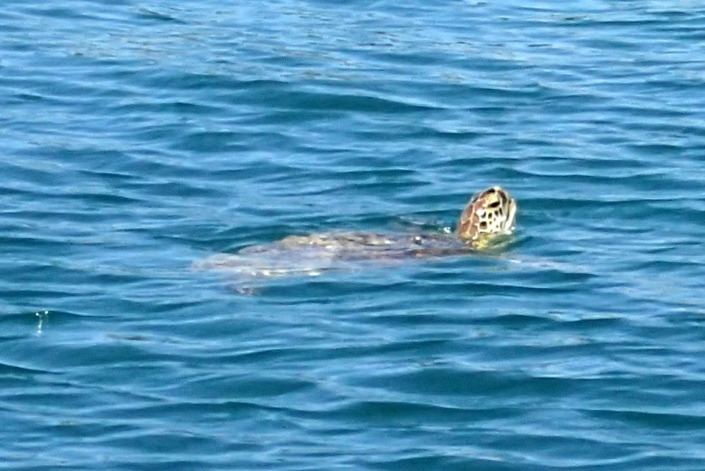 A quick trip to the grocery store, and then we took the dinghy back to the boat. Part way across the harbor, we encountered several turtles. Just their heads above water, occasionally, when they came up for air.