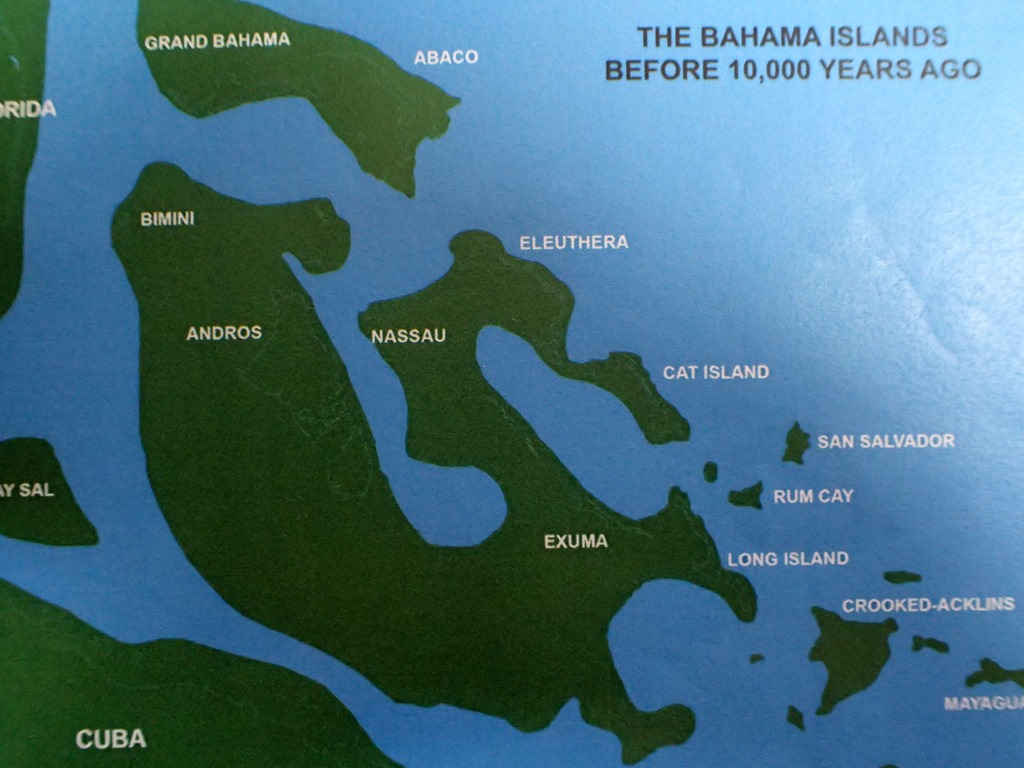 Did you know that before 10,000 years ago, when the sea levels were more than 400 feet lower than today, the “banks,” or shallows between the islands of the Bahamas were actually dry land?   In this picture, the dark green represents large land masses in what is now the Bahamas.