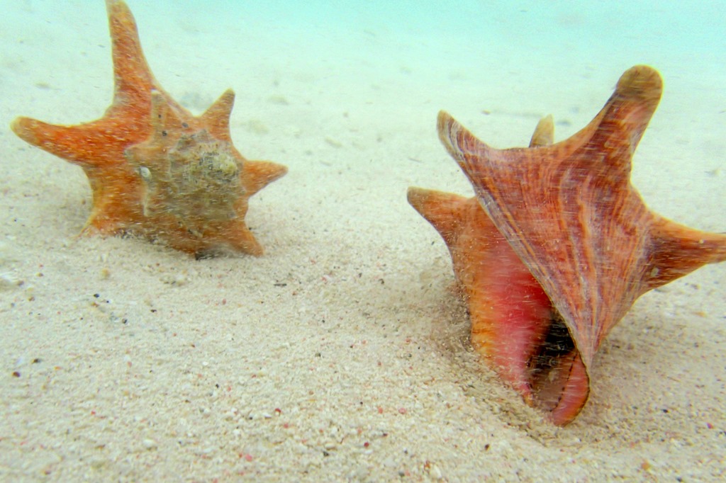 Conch (konk) is present throughout the Caribbean; they are most indigenous to the Bahamas. These large marine snails live in amazingly beautiful pink-lipped shells. Their shells are popular for jewelry and make fairly competent trumpets. Blown here in the harbor at sunset.