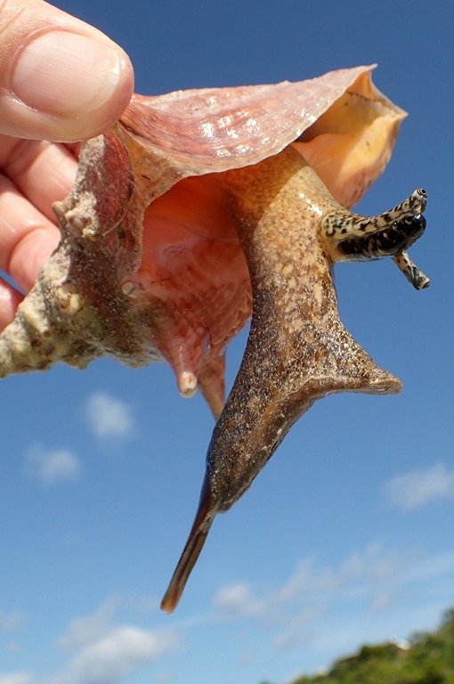 Inside, is the actual conch. First out of the shell is a claw, used to pull the conch along through sand. You can also see its “eyes.”