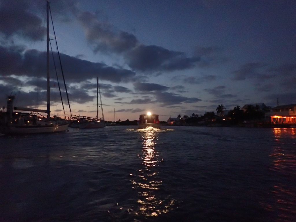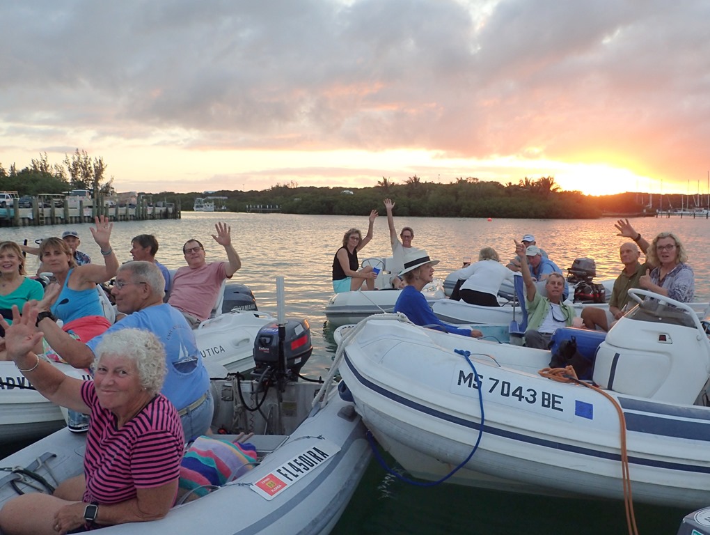 “Full moon dinghy drift” was the call on the morning net. Forty boats meet by the marina at 5pm and tie themselves together: hard and soft bottom inflatables, Whalers, center consoles, Fatty Knees – all haphazardly joined according to their arrival time.