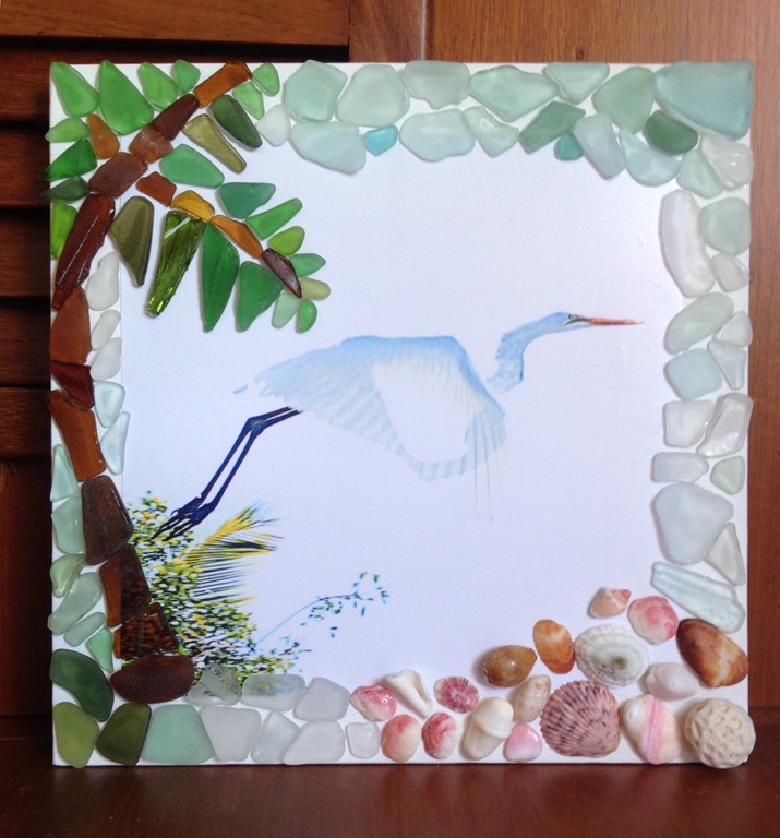 It’s a photo of an egret taking off by the Hope Town Sailing Club dock, framed with sea glass and shells. Fun.