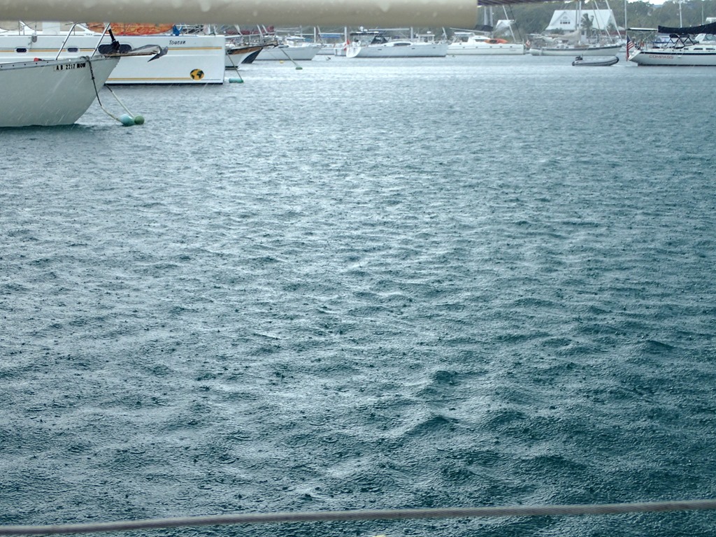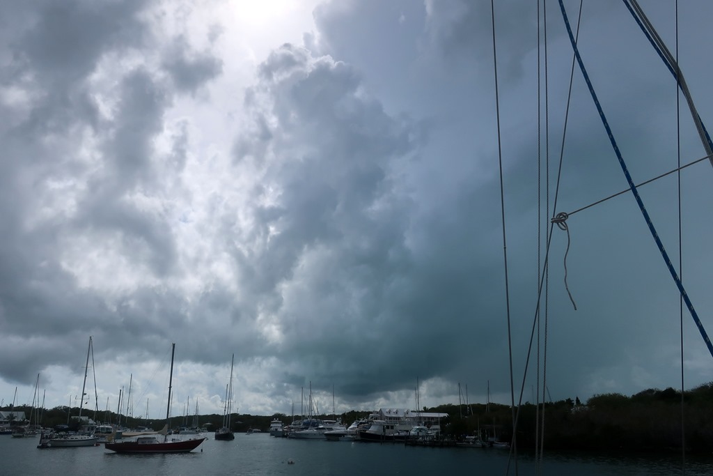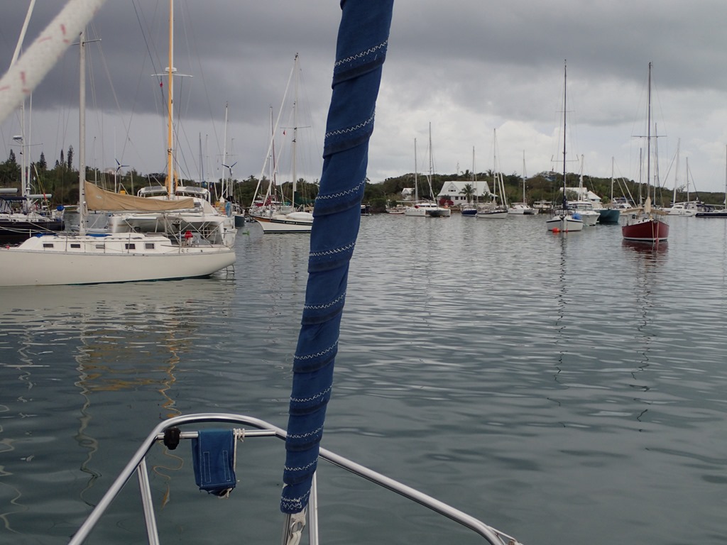 Normally, the boats are facing into the wind. But Motu Iti’s bow is perpendicular to the white boat and facing the red boat on the far right, almost head on. With barely a breath of air, Motu Iti is responding to tidal currents. The other boats, farther inside the harbor, aren’t as affected by the tide. But the wind filled in and by nightfall, we were rocking and rolling on our mooring. Gusts up to 40 mph were recorded during the night. Hard to sleep.