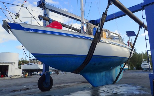 Motu Iti has been prepared for her long summer nap, at Abaco Yacht Services in Black Sound at Green Turtle Cay. Here she is waiting by the AYS service well early Wednesday morning.